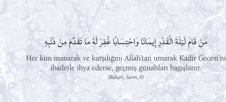 Hadisler, Ramazan Ramazan Her kim inanarak ve karşılığını Allah’tan umarak Kadir Gecesi’ni ibadetle ihya ederse, geçmiş günahları bağışlanır. (Buhari Savm 6)