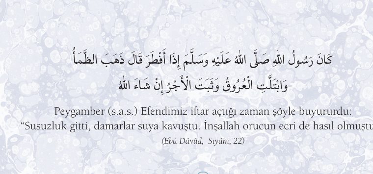 Hadisler, Ramazan Ramazan Peygamber (s.a.s) Efendimiz iftar açtığı zaman şöyle buyururdu: “Susuzluk gitti, damarlar suya kavuştu. İnşallah orucun ecri de hasıl olmuştur.” (Ebu…