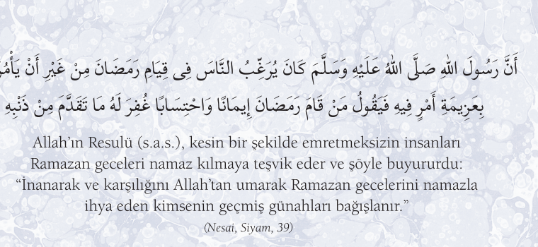 Hadisler, Ramazan Ramazan Allah’ın Resulü (s.a.s) kesin bir şekilde emretmeksizin insanları Ramazan geceleri namaz kılmaya teşvik eder ve şöyle buyururdu: “İnanarak ve karşılığını…
