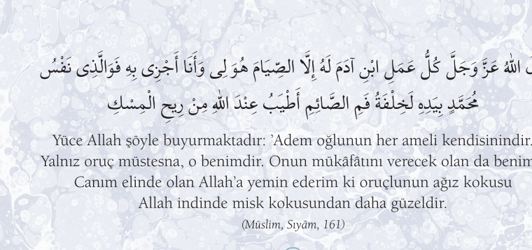 Hadisler, Ramazan Ramazan Yüce Allah şöyle buyurmaktadır: “Adem oğlunun her ameli kendisinindir. Yalnız oruç müstesna, o benimdir. Onun mükafatını verecek olan da benim.”…