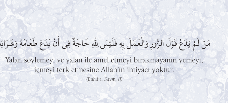 Hadisler, Ramazan Ramazan Yalan söylemeyi ve yalan ile amel etmeyi bırakmayanın yemeyi, içmeyi terk etmesine Allah’ın ihtiyacı yoktur. (Buhari Savm 8)