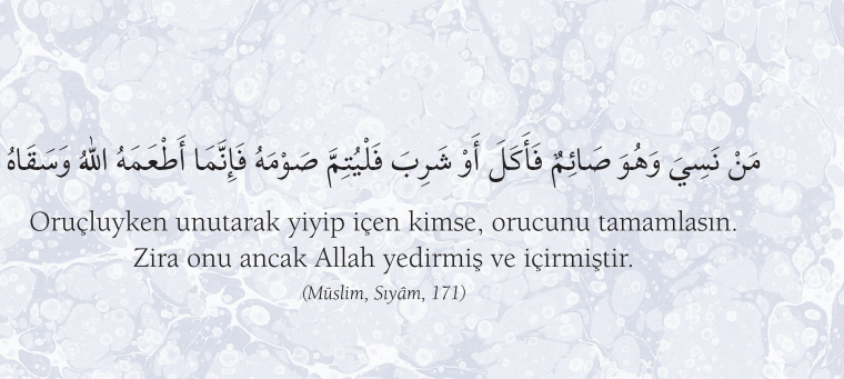 Hadisler, Ramazan Ramazan Oruçluyken unutarak yeyip içen kimse, orucunu tamamlasın. Zira onu ancak Allah yedirmiş ve içirmiştir. (Müslim Sıyam 171)