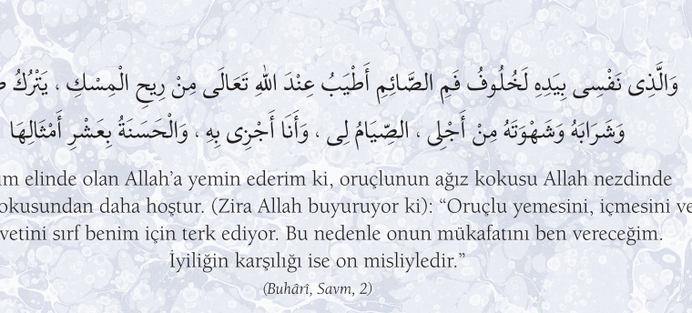 Hadisler, Ramazan Ramazan Canım elinde olan Allah’a yemin ederim ki, oruçlunun ağız kokusu Allah nezdinde misk kokusundan daha hoştur. (Zira Allah buyuruyor ki)…