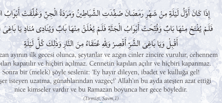 Hadisler, Ramazan Ramazan Ramazan ayının ilk gecesi olunca, şeytanlar ve azgın cinler zincire vurulur, cehennem kapıları kapatılır ve hiçbiri açılmaz. Cennetin kapıları açılır…
