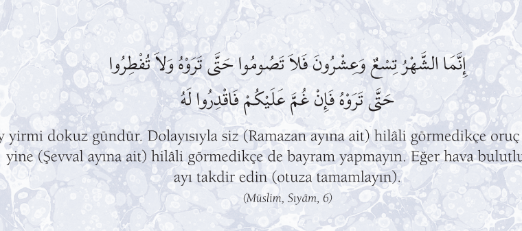 Hadisler, Ramazan Ramazan Ay yirmi dokuz gündür. Dolayısıyla siz (Ramazan ayına ait) hilali görmedikçe oruç tutmayın, yine (Şevval ayına ait) hilali görmedikçe de…