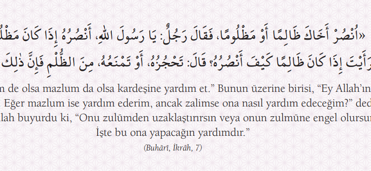 Hadisler, Tevhid ve Vahdet Tevhid ve Vahdet “Zalim de olsa mazlum da olsa kardeşine yardım et.” Bunun üzerine birisi, “Ey Allah’ın Rasûlü! Eğer mazlum ise yardım ederim,…