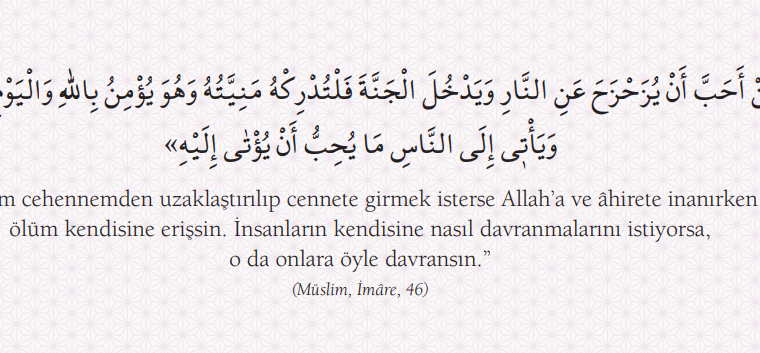 Hadisler, Tevhid ve Vahdet Tevhid ve Vahdet “Kim cehennemden uzaklaştırılıp cennete girmek isterse Allah’a ve âhirete inanırken ölüm kendisine erişsin. İnsanların kendisine nasıl davranmalarını istiyorsa, o da…