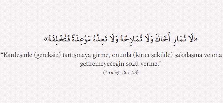 Hadisler, Tevhid ve Vahdet Tevhid ve Vahdet “Kardeşinle (gereksiz) tartışmaya girme, onunla (kırıcı şekilde) şakalaşma ve ona yerine getiremeyeceğin sözü verme.” (Tirmizî, Birr, 58)