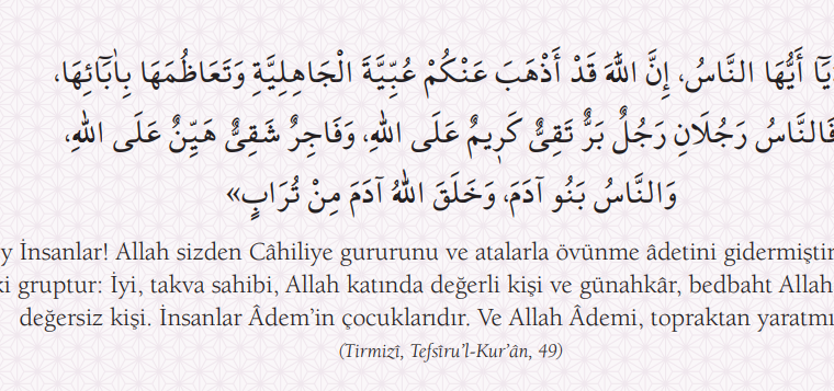 Hadisler, Tevhid ve Vahdet Tevhid ve Vahdet “Ey İnsanlar! Allah sizden Câhiliye gururunu ve atalarla övünme âdetini gidermiştir. İnsanlar iki gruptur: İyi, takva sahibi, Allah katında değerli…