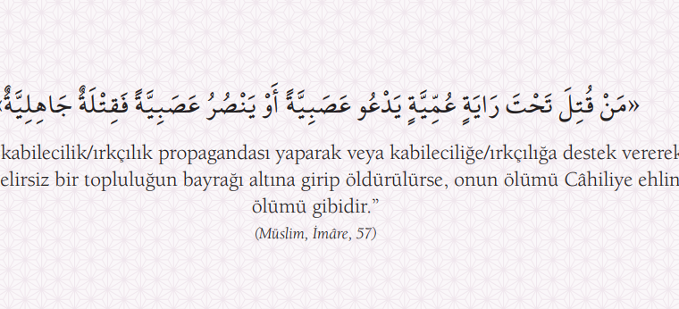 Hadisler, Tevhid ve Vahdet Tevhid ve Vahdet “Kim kabilecilik/ırkçılık propagandası yaparak veya kabileciliğe/ırkçılığa destek vererek gayesi belirsiz bir topluluğun bayrağı altına girip öldürülürse, onun ölümü Câhiliye ehlinin…