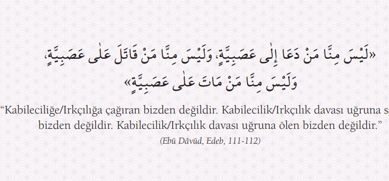 Hadisler, Tevhid ve Vahdet Tevhid ve Vahdet “Kabileciliğe/Irkçılığa çağıran bizden değildir. Kabilecilik/Irkçılık davası uğruna savaşan bizden değildir. Kabilecilik/Irkçılık davası uğruna ölen bizden değildir.” (Ebû Dâvûd, Edeb, 111-112)